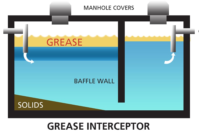 A novice may imagine a grease interceptor to be one big chamber that catches all the grease. In reality, there are many components, including many interconnected chambers, each with their own manhole. This greatly increases the efficiency of the system and makes it almost impossible for any overflow of waste to occur. With such a system of irregular chambers, the greasy waste tends to accumulate on the sides and edges by design. The problem with this system is that it does make the process of cleaning and pumping the grease interceptor a bit more complex than simply washing and pumping.